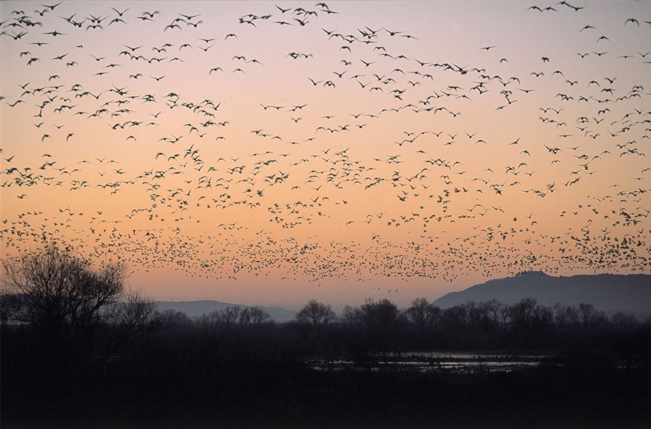 マガンは蕪栗沼を夜のねぐらとし、日中は水田で落ち穂や雑草などを食べている。日の出とともに数万羽の群れが周辺の水田に向かって沼を飛び立つ光 景は、蕪栗沼の冬の風物詩となっている。また夕方には、周辺水田から沼に戻ってくる「ねぐら入り」が見られる。