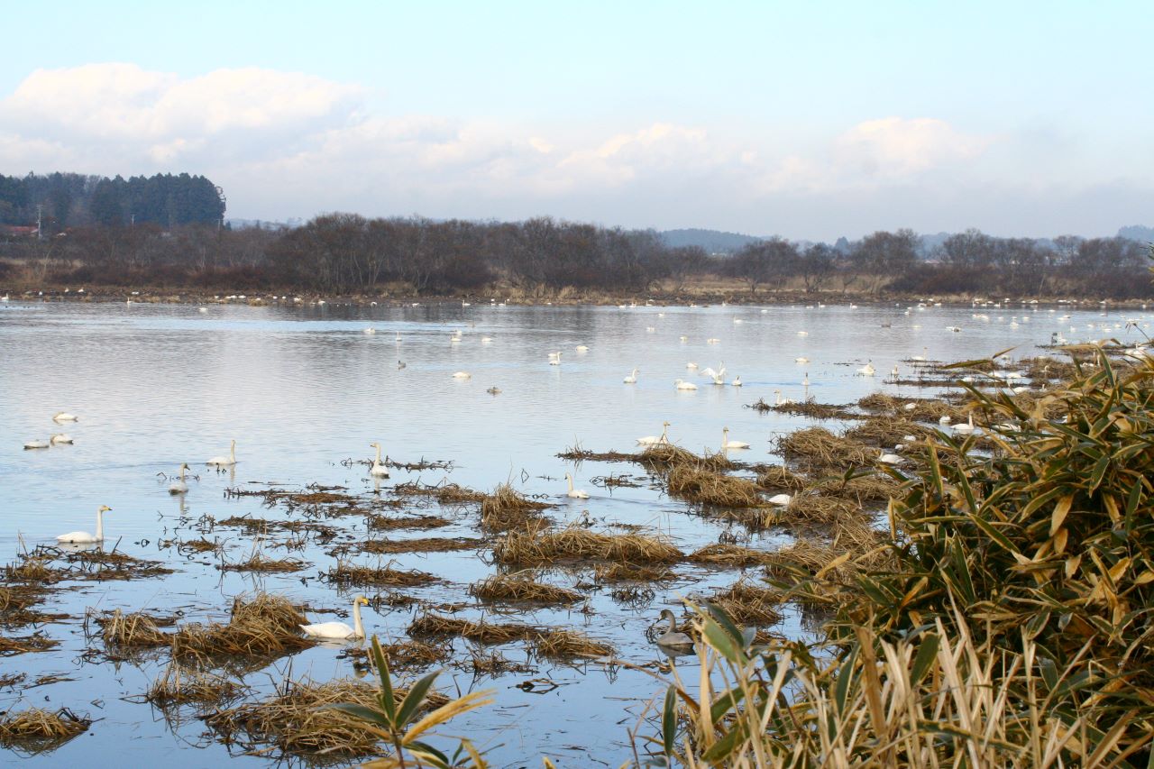 全長約140cm翼開長220cmの大型のカモ科水鳥で、冬に300羽前後が飛来する。オオハクチョウは主に川や湖沼のマコモを食べるため、 水田を採食地とするマガンやシジュウカラガンのように数が多くない。逆に宮城県の他の地域でも良く見られる鳥である。