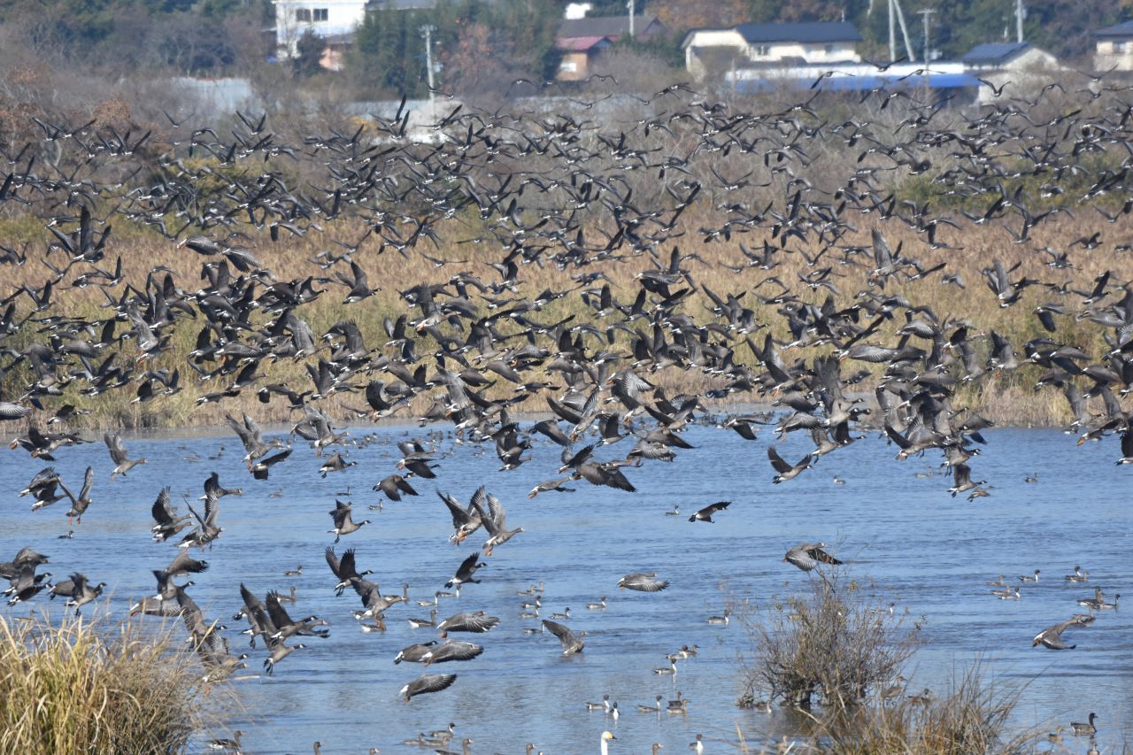 マガンと同じく、朝ねぐらである沼を飛び立って、日中は周辺水田にいる。夕方になると沼に戻ってくるねぐら入りが観察できる。