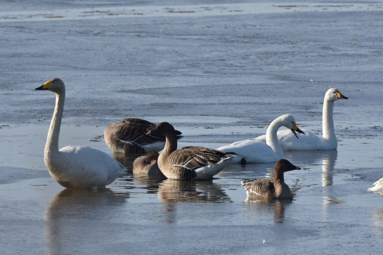 オオハクチョウとオオヒシクイとコハクチョウ(2021.01.25撮影)