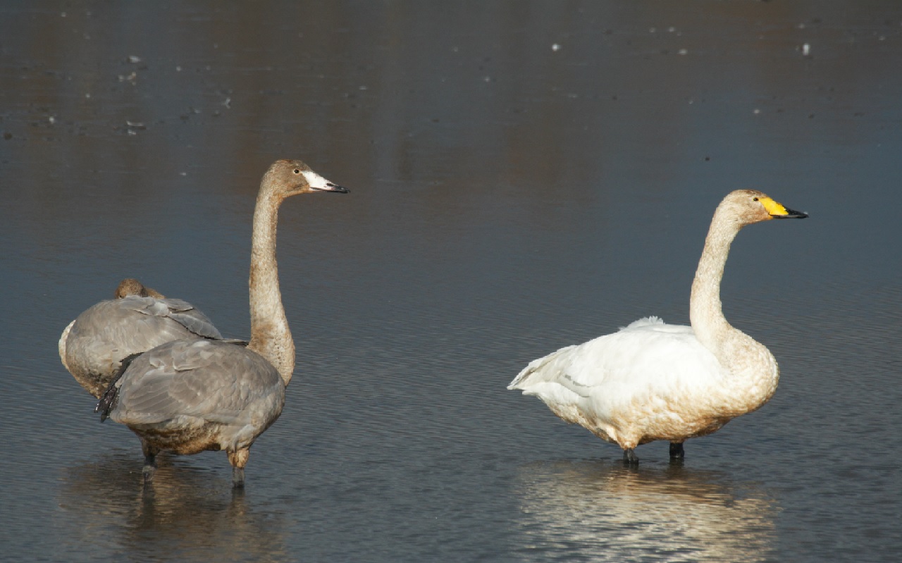 オオハクチョウはガン類と比べ小さな群れ、家族群で行動することが多いようである。灰色の幼鳥の姿も良く観察できる。