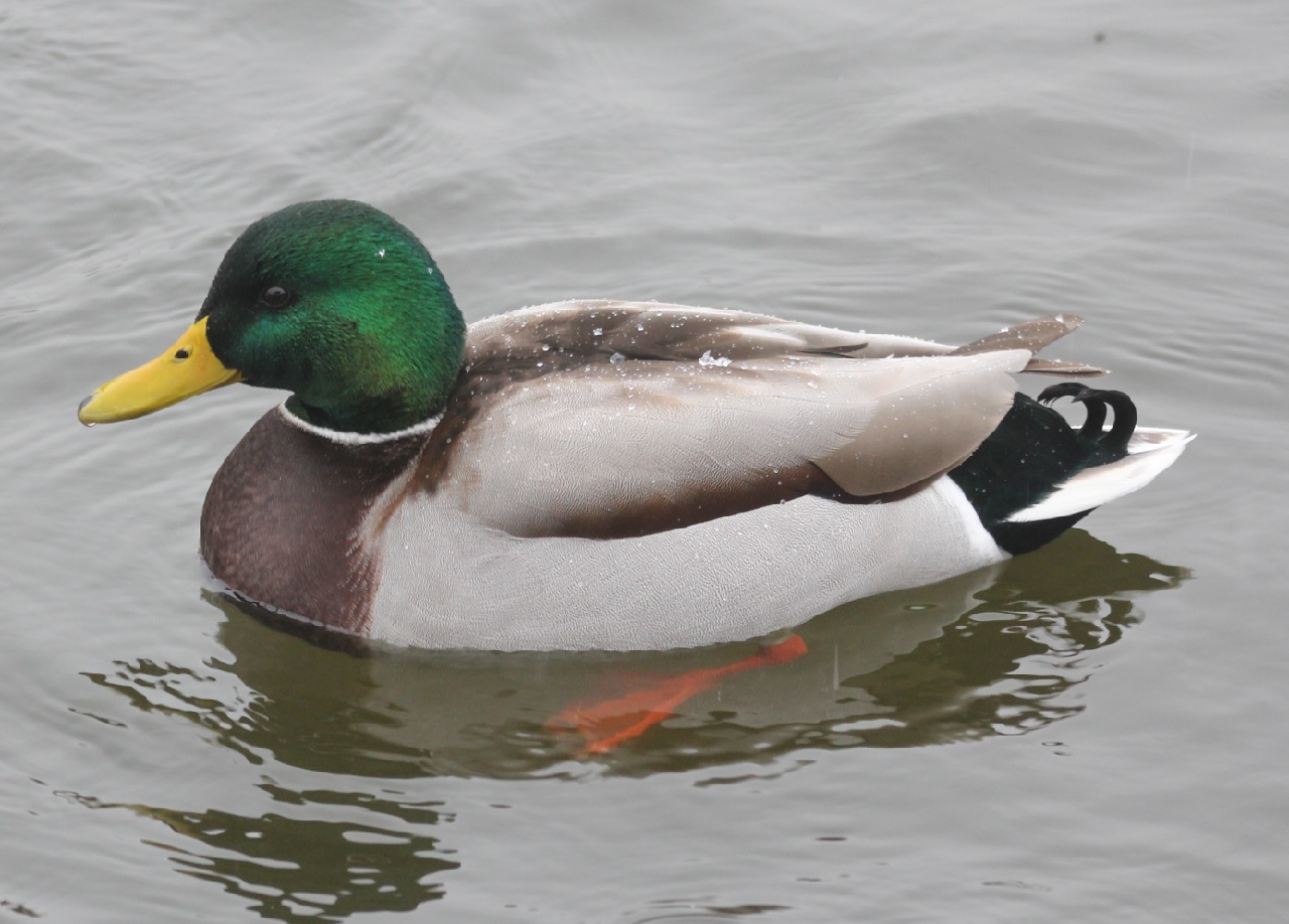 体長50cmのカモ目カモ科の水鳥で、主に冬に蕪栗沼に数百羽が飛来する。緑色の頭と、黄色いくちばしが特徴。アヒルの原種である。