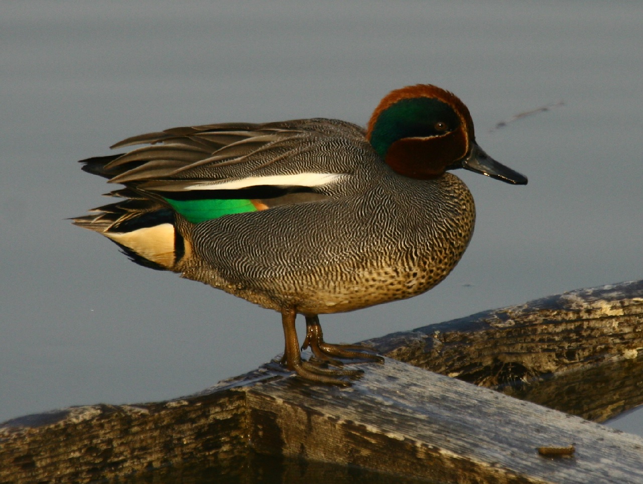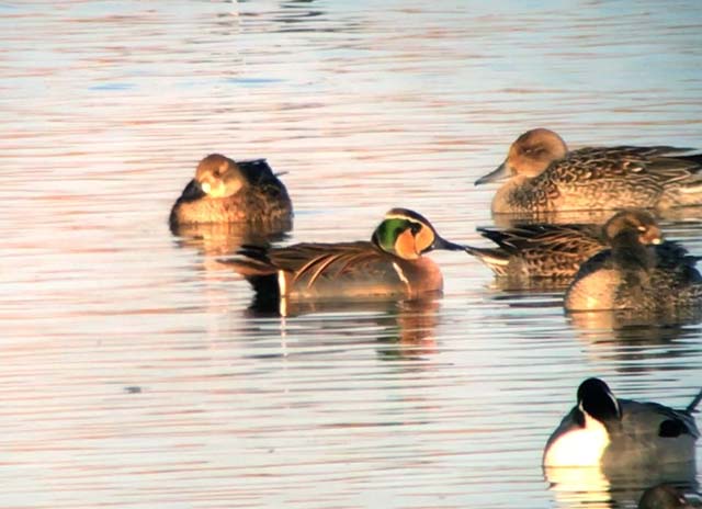 体長35cmのカモ目カモ科の小型の水鳥で、主に冬に蕪栗沼に数百羽が飛来する。緑と茶色の頭部と、他のカモ類に比べて小さいのが特徴。