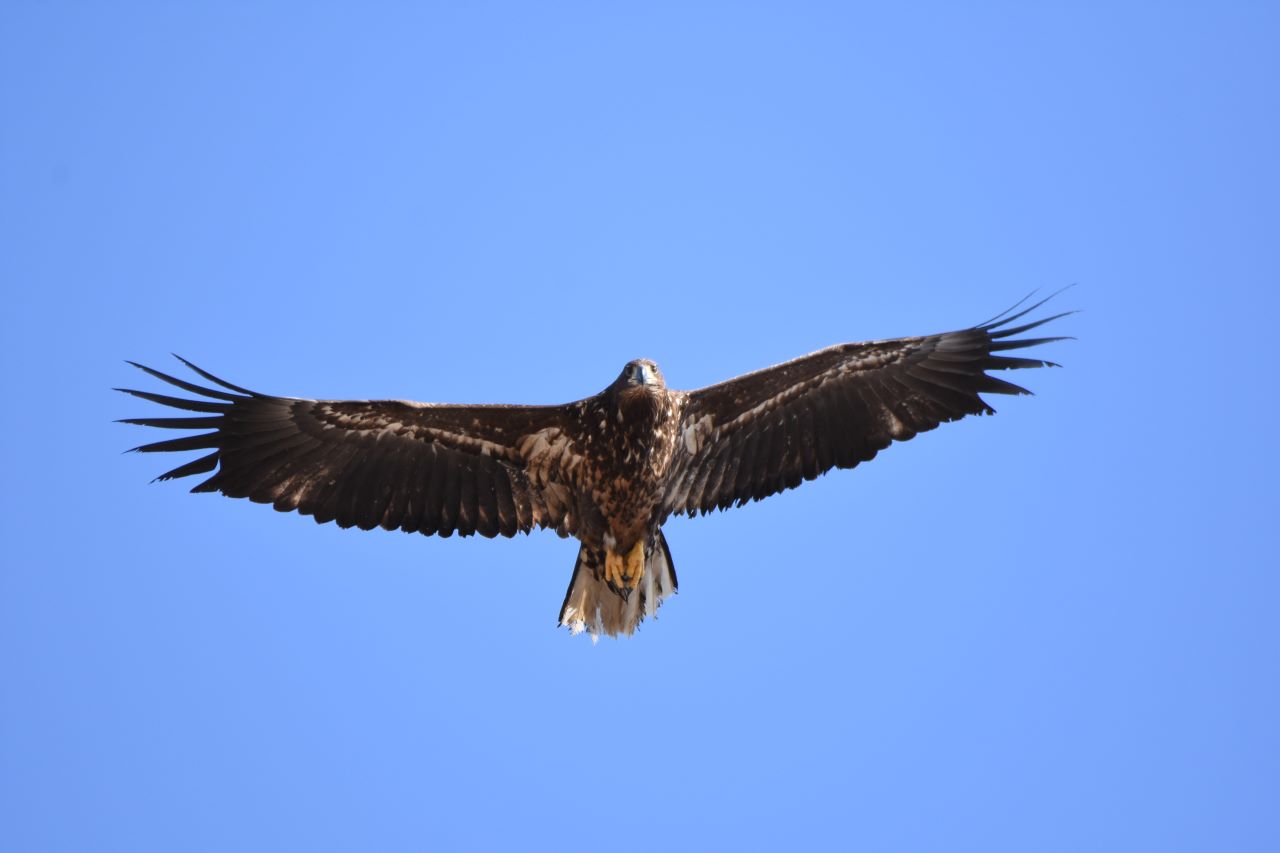 タカ目タカ科の大型のワシタカ類で、全長約80cm、翼開長約210cmにもなる。メスのほうがオスより大きいとされる。尾羽が白いのが特徴 である。蕪栗沼では、冬にカモ類を捕獲するために凍結した沼に飛来する。