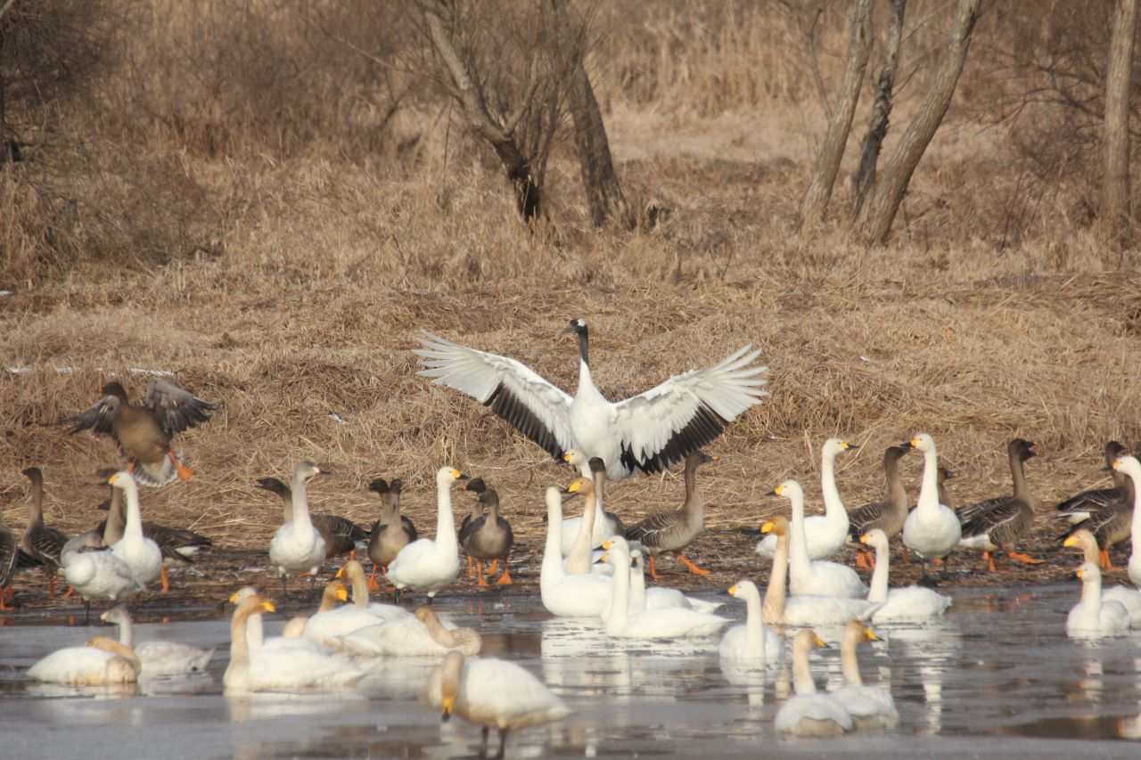 オオヒシクイを威嚇するタンチョウ