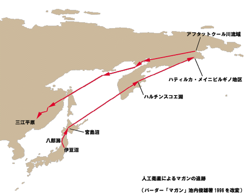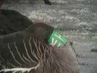 日本に飛来するマガンは、極東ロシアのツンドラ地帯で繁殖していると考えられています。1995年に伊豆沼の北の水田でマガンを捕獲し、発信器の 電波を衛星で追跡する調査が、日本雁を保護する会を中心に行われ、シベリアの北極圏に近い場所まで追跡されました。 ![]() 首輪標識をつけてマガン
