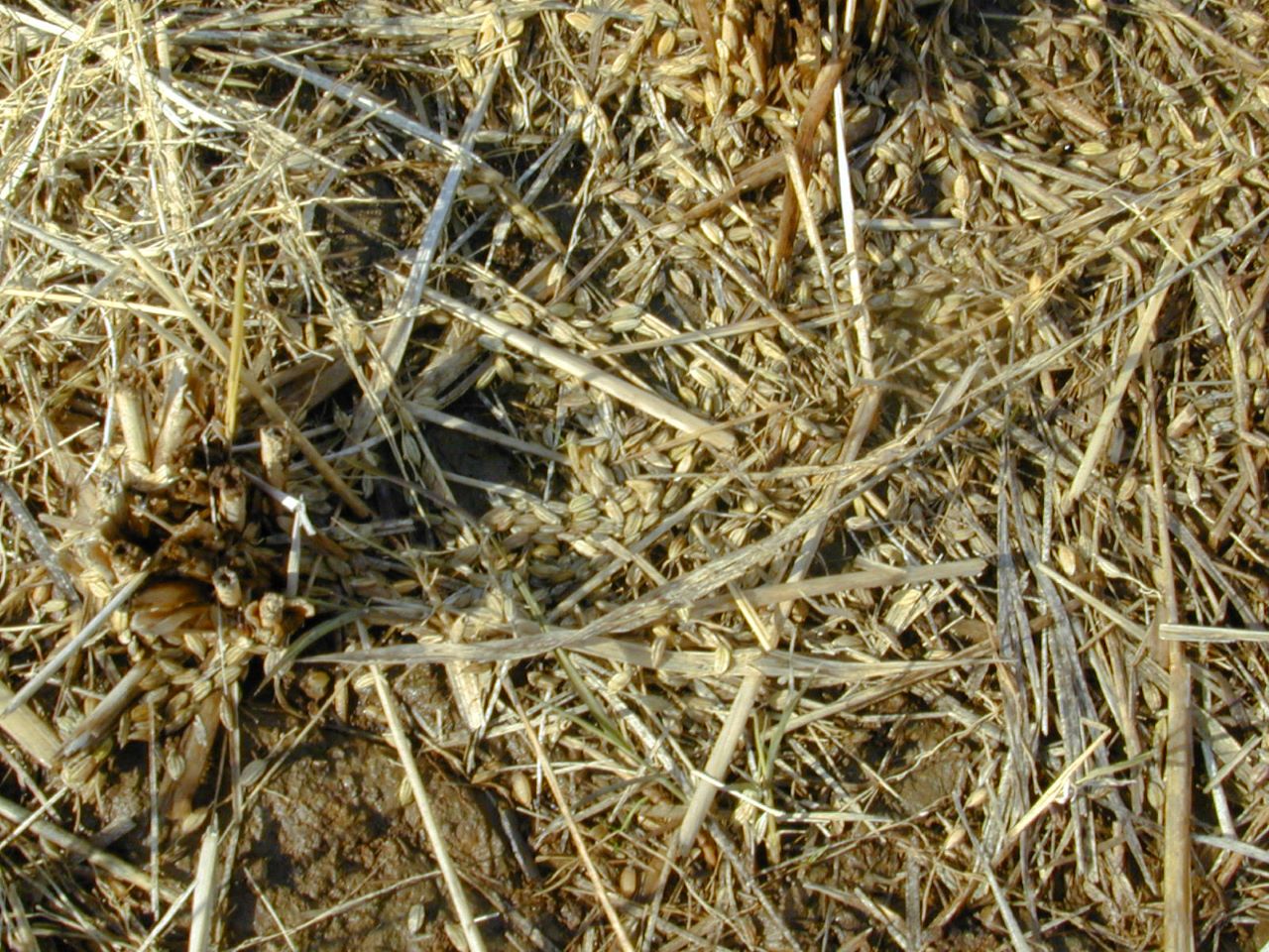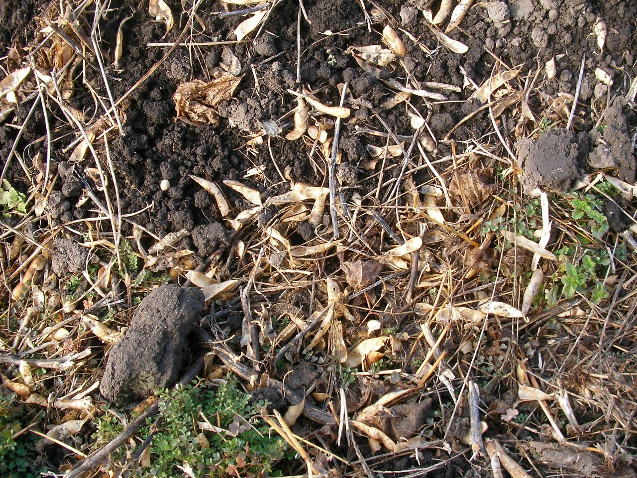 かつては「ニオ」や「ホニオ」と呼ばれている天日干しの稲を食べられる食害が多く発生していました。現在は稲の刈り取り方法がコンバイン主流に なったため、モミの乾燥は機械で行うようになったため、食害は少なくなっています。また水田のあぜの周辺の稲が食べられる食害がマガンによると考 えられていましたが、夜間であることや、マガンが背丈の高い植物の近くを好まないことなどから、現在はカモやタヌキによるものと考えられていま す。 水田に落ちている落ち穂(左)と豆(右)