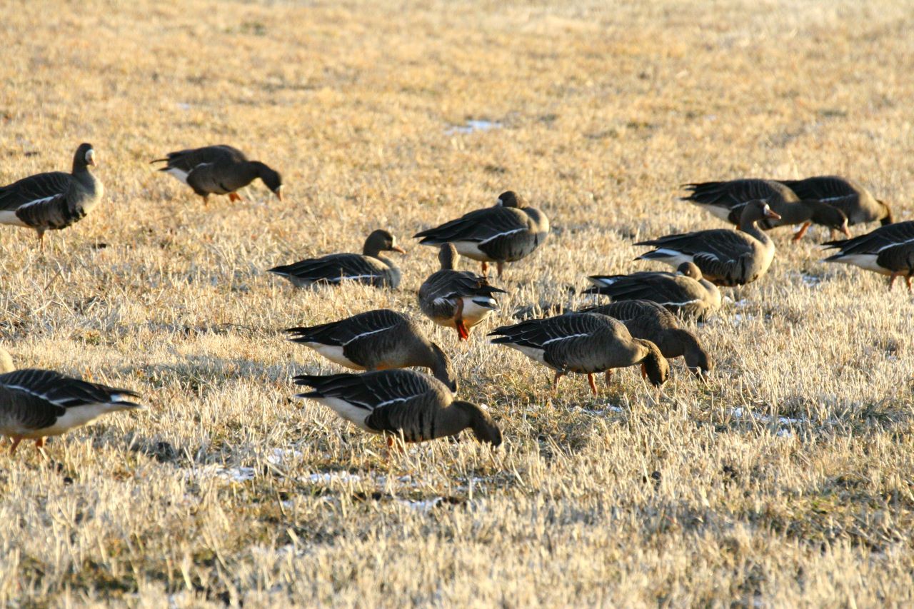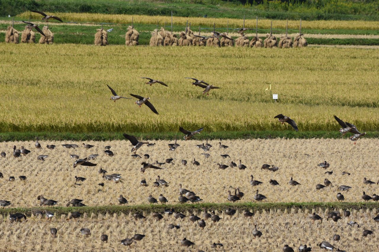 | 宮城県に冬に飛来したマガンは、伊豆沼・内沼や蕪栗沼などの湖沼をねぐらとし、日中は周辺水田で採食しています。食べるものは、落ち穂や豆、