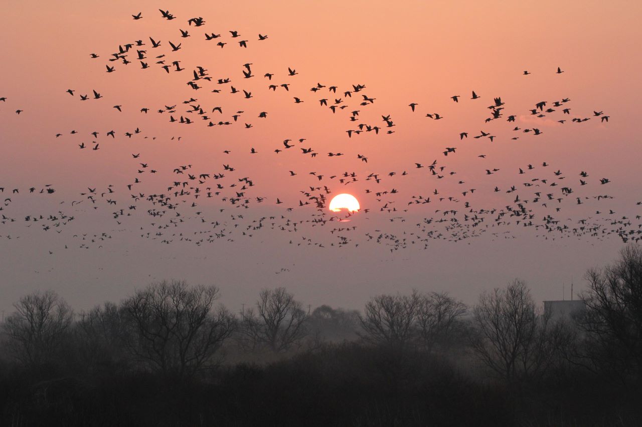 蕪栗沼には9月20日前後に第一陣が渡ってきます。その後10月中には数万羽となり、11月に最盛期を迎えます。1月の下旬から北へ帰り始