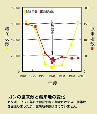 治以降に狩猟が解禁されたことと、開発によって生息地となる湿地帯が減少したことが原因と考えられています。![]() 日本雁を保護する会調べ