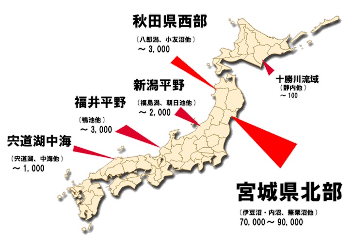 とともに、大崎市古川の化女沼、登米市豊里町の平筒沼、旧迫川河道、長沼などねぐらとなり、少しずつ範囲が拡大しています。![]() |