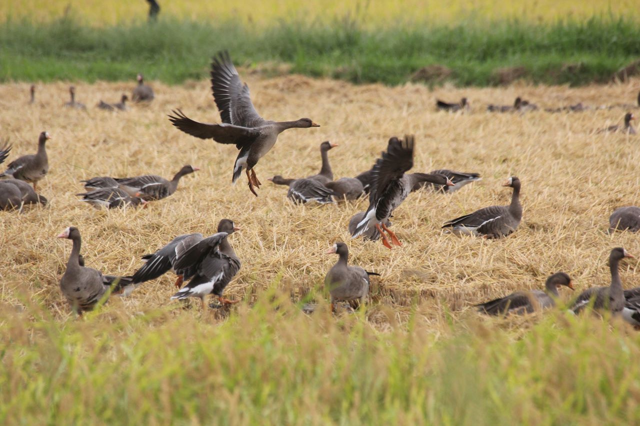 雑草などです。落ち穂の割合は3割程度とも言われており、マガンは稲作や水田と密接な関係があります。 水田で採食するマガン(2017.10.8)遠くにホニオが見える