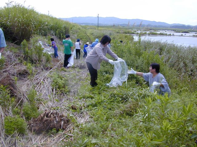 蕪栗沼は遊水地であるため、増水時に上流の河川で不法投棄されたゴミが流れついてきます。このような流入ゴミを回収する清掃活動を行っていま す。また不法投棄の現場を発見した場合は、監視カメラなどの映像とともに行政機関や警察に通報しています。