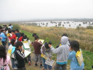 蕪栗沼の渡り鳥や野生生物などの貴重な自然環境、遊水地と治水の重要性、農業と渡り鳥の共生などについて学んでもらうために、環境教育授業を 実施しています。また図鑑シートやポスターなどの教材の作成をしています。