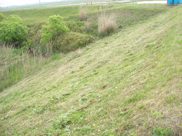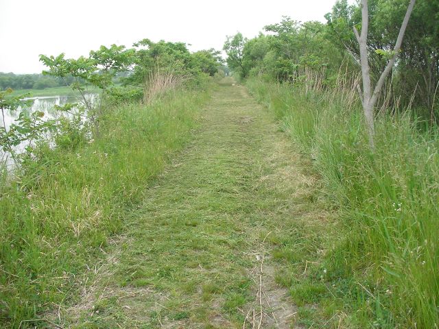 遊水地とは、いぎょう堤(囲ぎょう堤)と呼ばれる高い堤防で囲まれた中に、増水した水を貯める施設です。動物の巣や倒木によって堤防が破損す ることを防ぐため、堤防法面の除草が重要です。蕪栗ぬまっこくらぶでは、白鳥地区の法面除草を行っています。同時に管理上必要な白鳥越流堤や周辺 堤防の天端、観察路、管理用巡視路の除草を行っています。